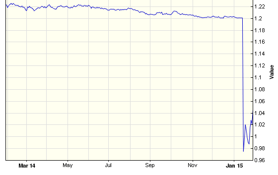 At 10.30 am on 15 January the Swiss Central Bank surprised the foreign exchange markets by announcing that it would no longer attempt to keep the Swiss Franc pegged at a rate of €1.20. The peg had been in being since 2011 with the aim of curtailing speculation and protecting Swiss exporters. As the graph shows, when the peg was removed the euro fell sharply against the Swiss Franc and has since settled at close to parity.